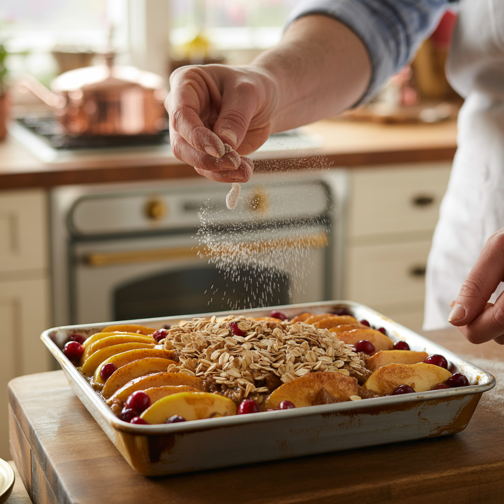 There’s something therapeutic about this moment—sprinkling the buttery, crunchy topping over the juicy fruit. This is when simple ingredients start coming together to create something special. Soon, the oven will work its magic, releasing an unbelievable aroma.